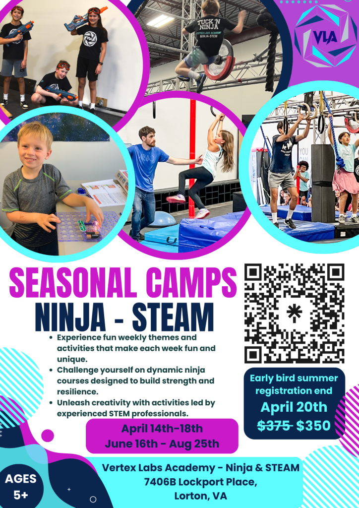 Discover a world of adventure and learning at Vertex Labs Academy's youth camps in Northern Virginia. We blend Ninja training with STEAM education to create unforgettable experiences that empower young minds and bodies. Join us for a summer of fun, growth, and discovery! Sign up today to secure your spot at Vertex Labs Academy's youth camps, where fun meets learning through Ninja training and engaging STEAM activities.